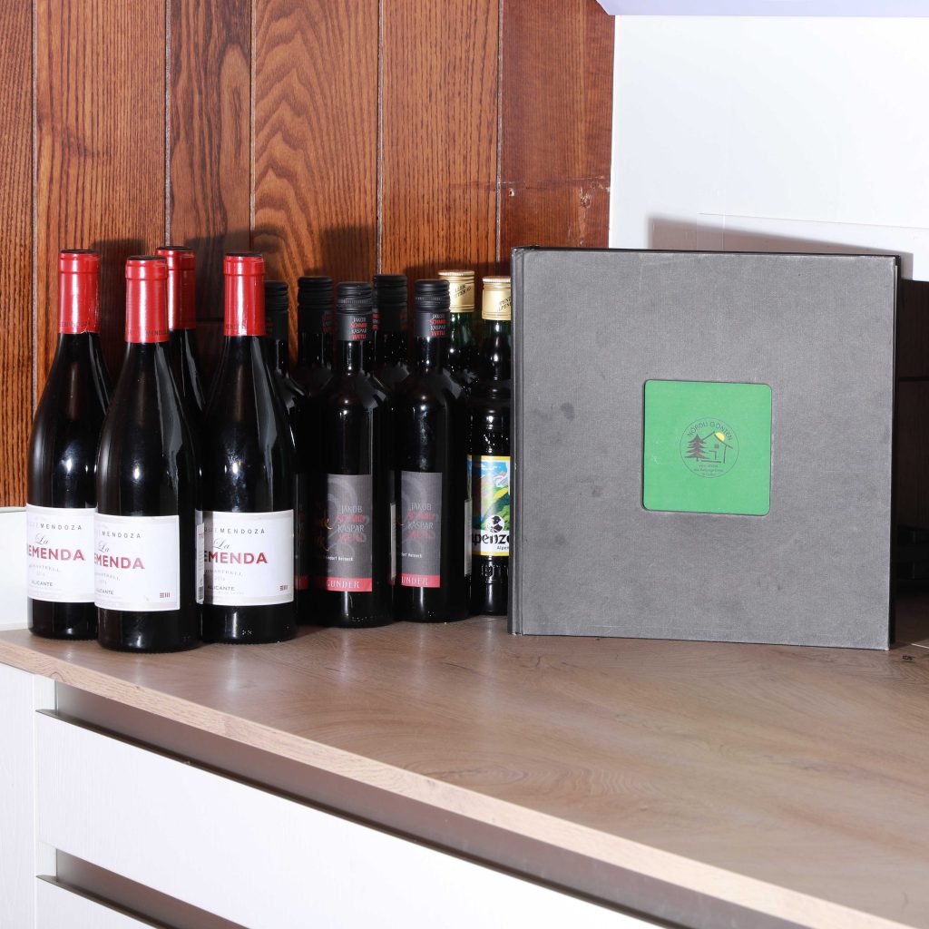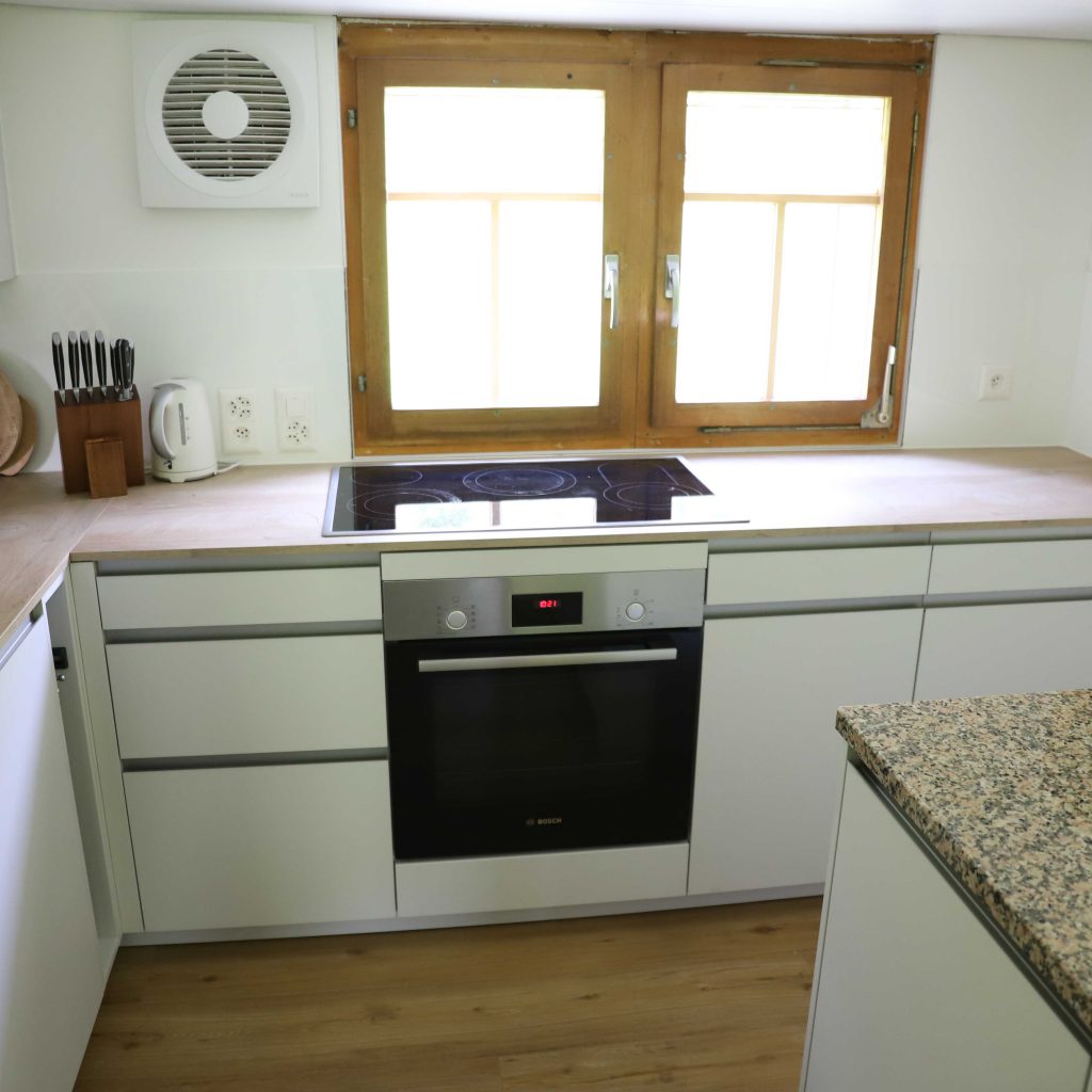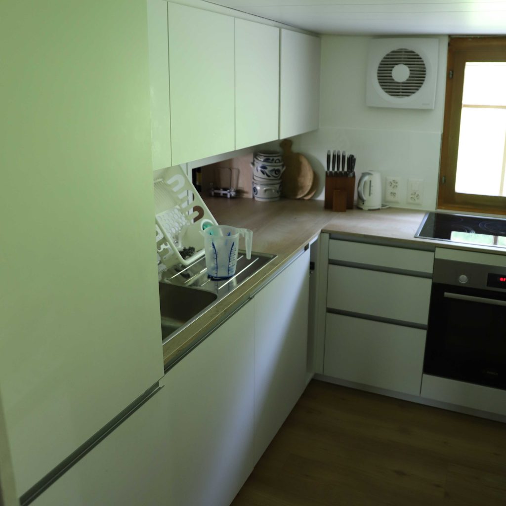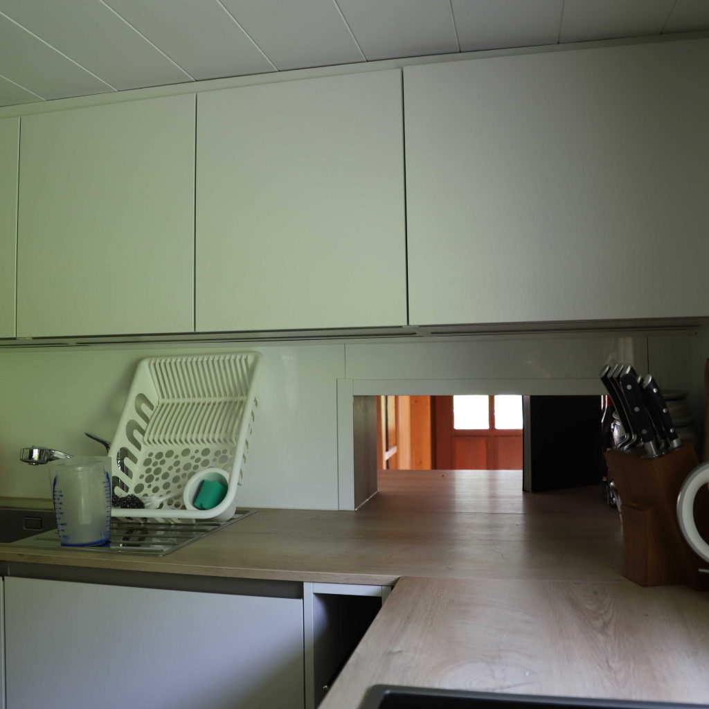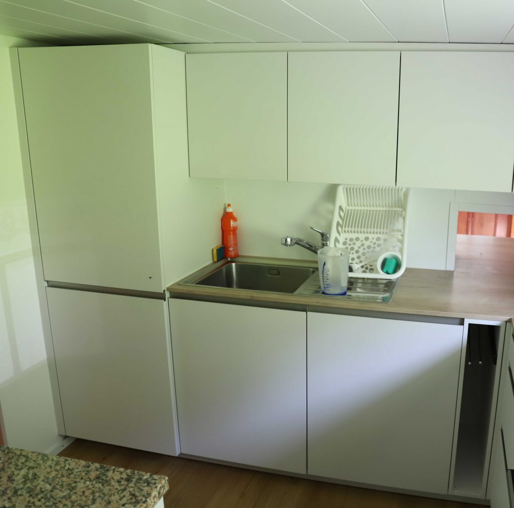 Die Küche ist mit Kochutensilien und Geschirr reich bestückt. Auch für eine Erfrischung ist dank dem Getränke-Kühlschrank gesorgt.